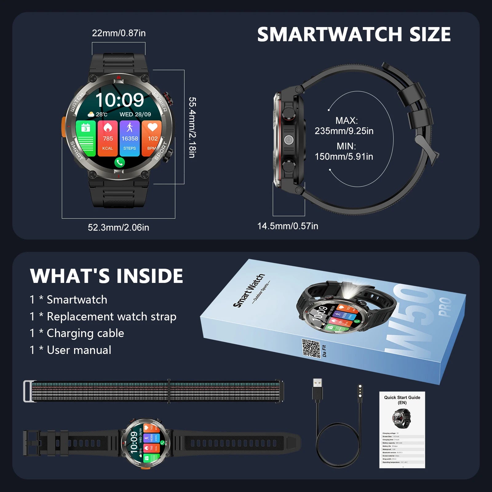 2025 New Blackview W50pro Waterproof Smartwatch with LED Flashlight Emergency lighting 960mAh Large Battery Life Man Smart Watch