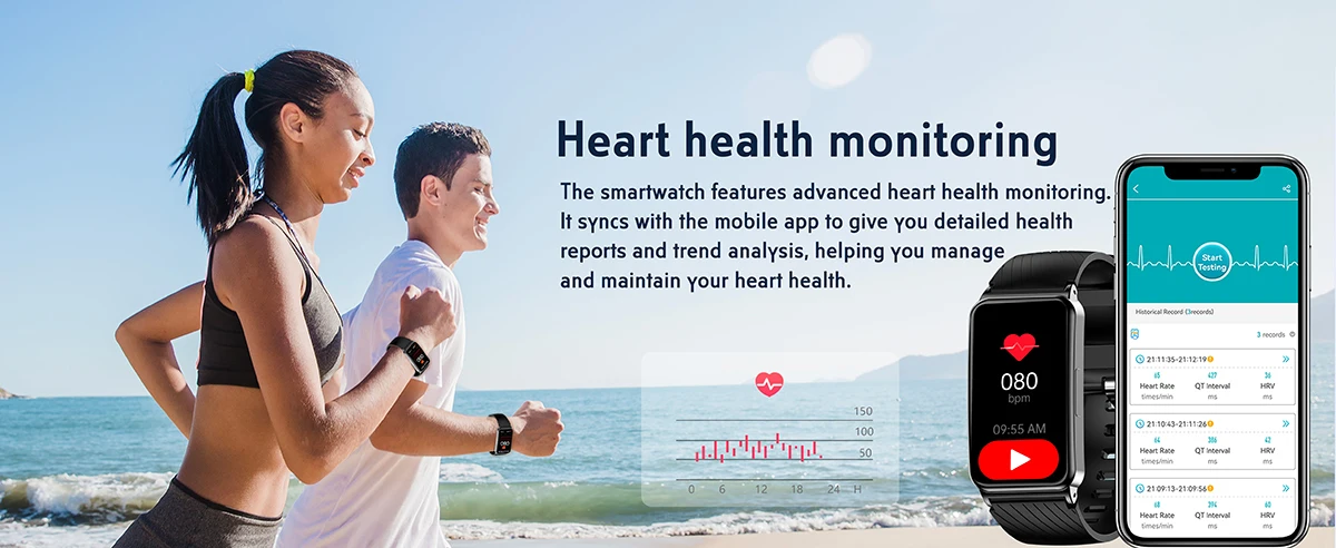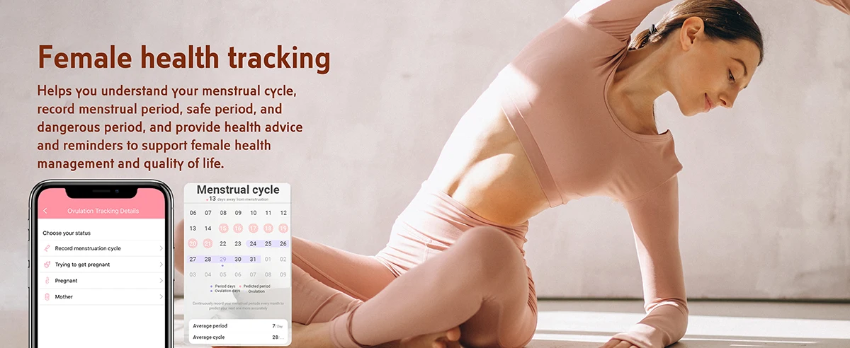 ECG, Heart rate monitoring, Blood pressure monitoring, Sleep monitoring, Blood oxygen monitoring, Body temperature monitoring, Women's health (menstrual tracking).