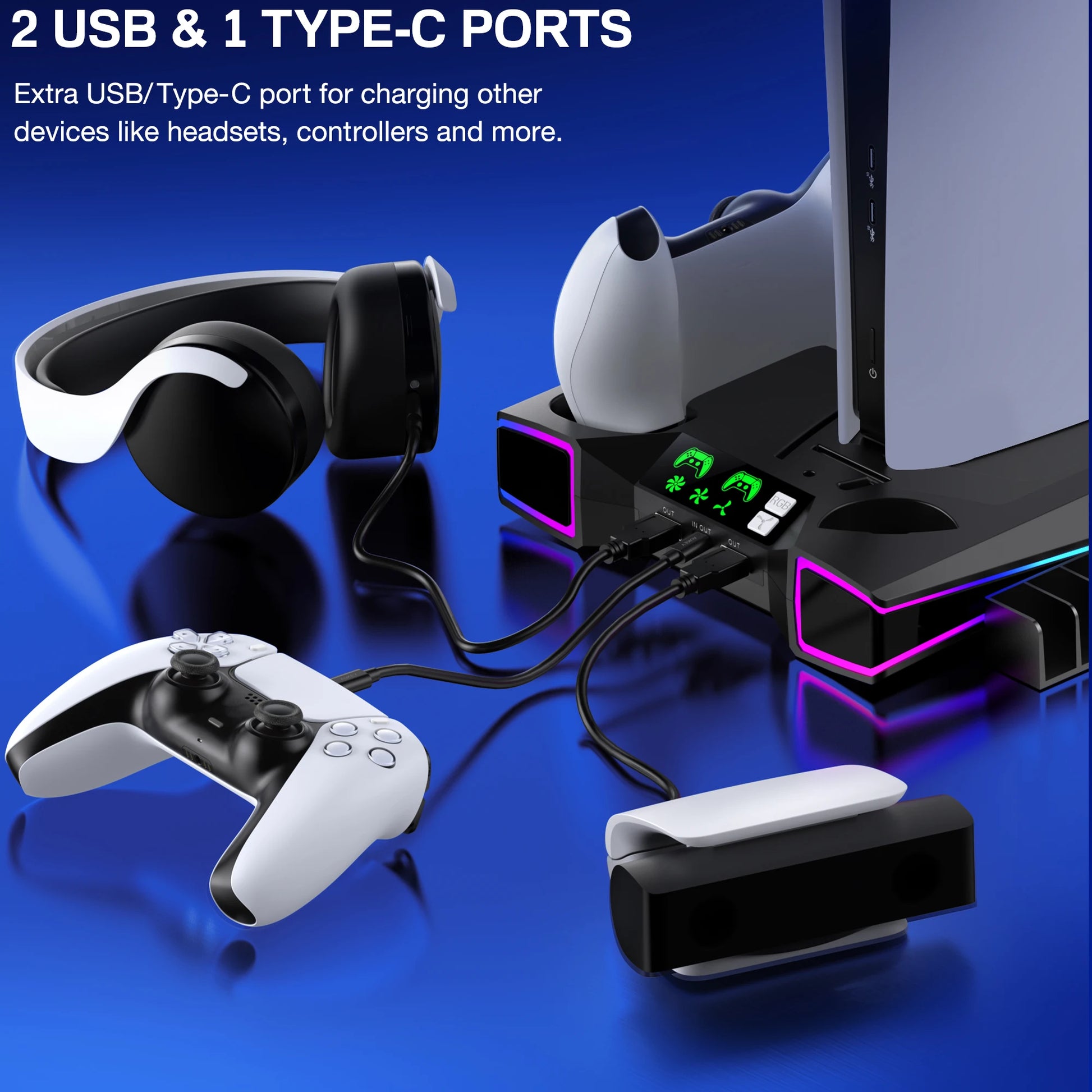 3 Charging Ports & Safety Protection – The docking station for ps5 with cooling fan features 2 USB and 1 Type-C charging ports to charge controllers, headsets, and other devices. It includes a built-in smart chip for protection against over-current, overcharging, and short circuits. This controller charger stand for ps5 provides a reliable, safe charging solution, making it a must-have cooling station and charging dock for your console and controllers