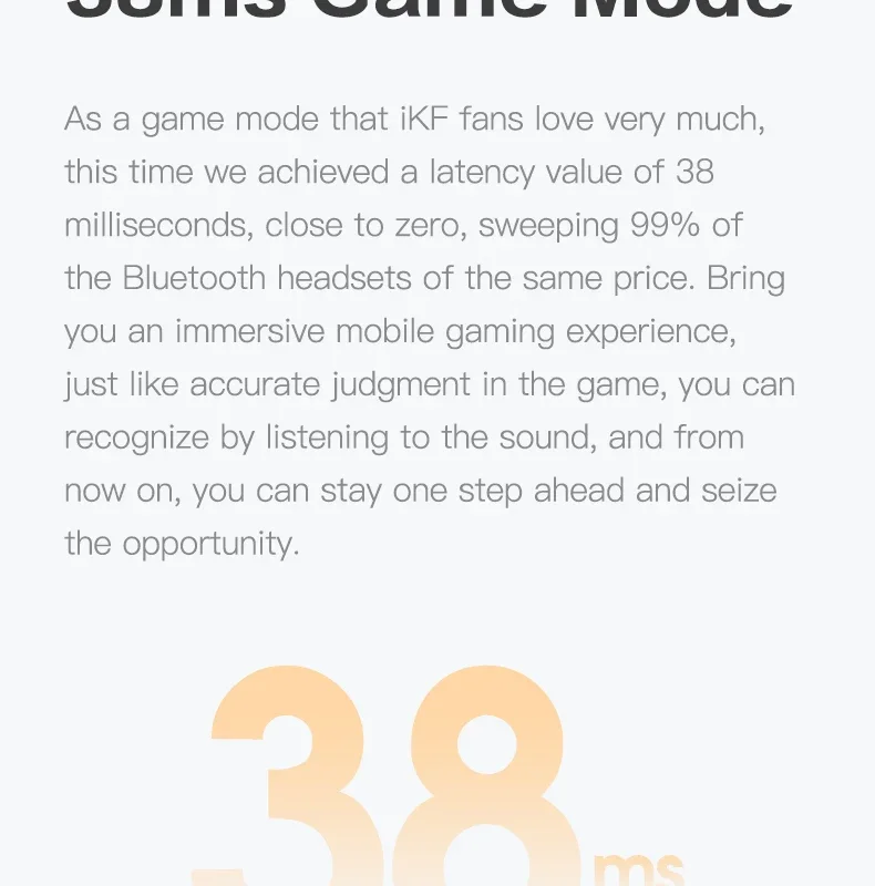 As a game mode that iKF fans love very much, this time we achieved a latency value of 38 milliseconds, close to zero, sweeping 99% of the Bluetooth headsets of the same price. Bring you an immersive mobile gaming experience, just like accurate judgment in the game, you can recognize by listening to the sound, and from now on, you can stay one step ahead and seize the opportunity.