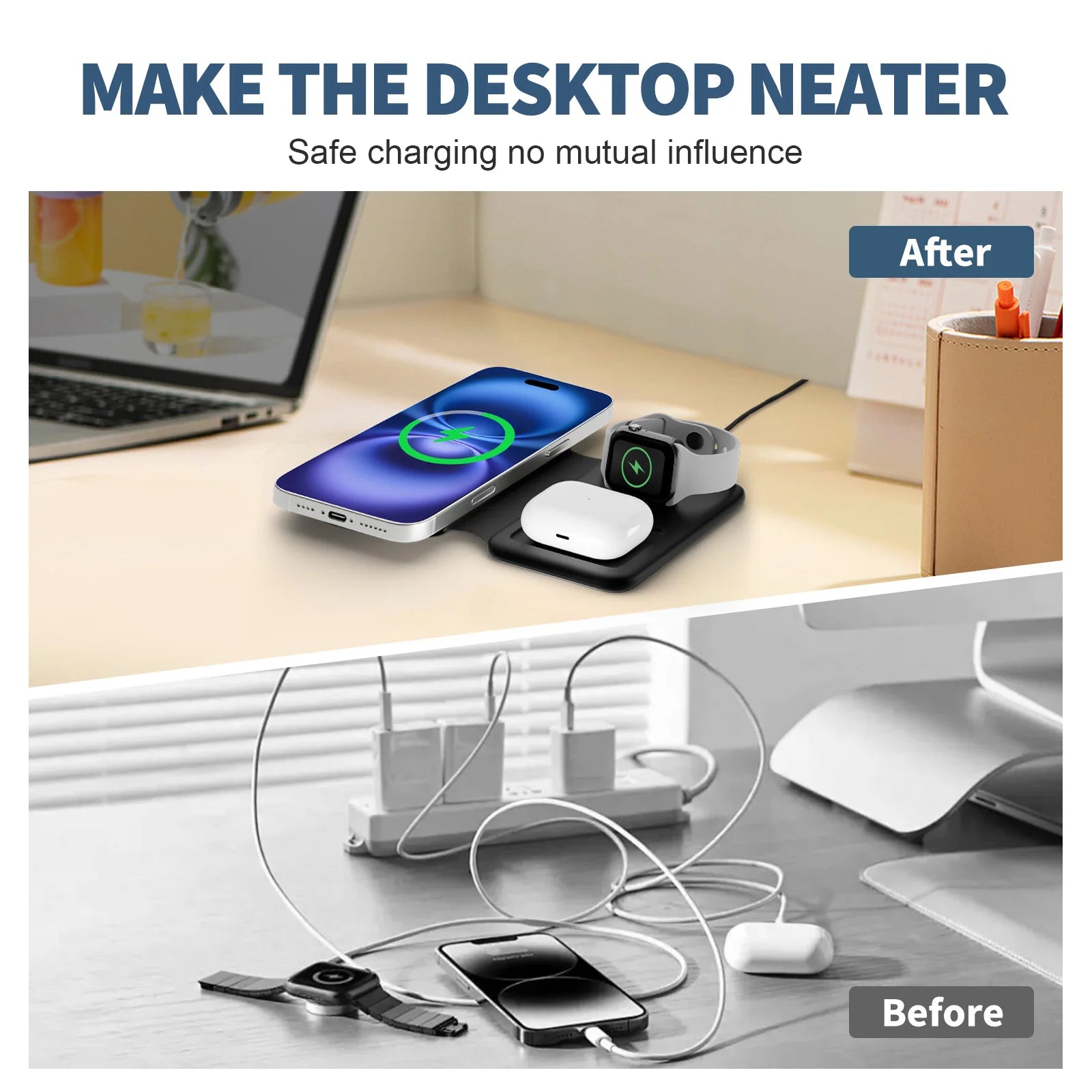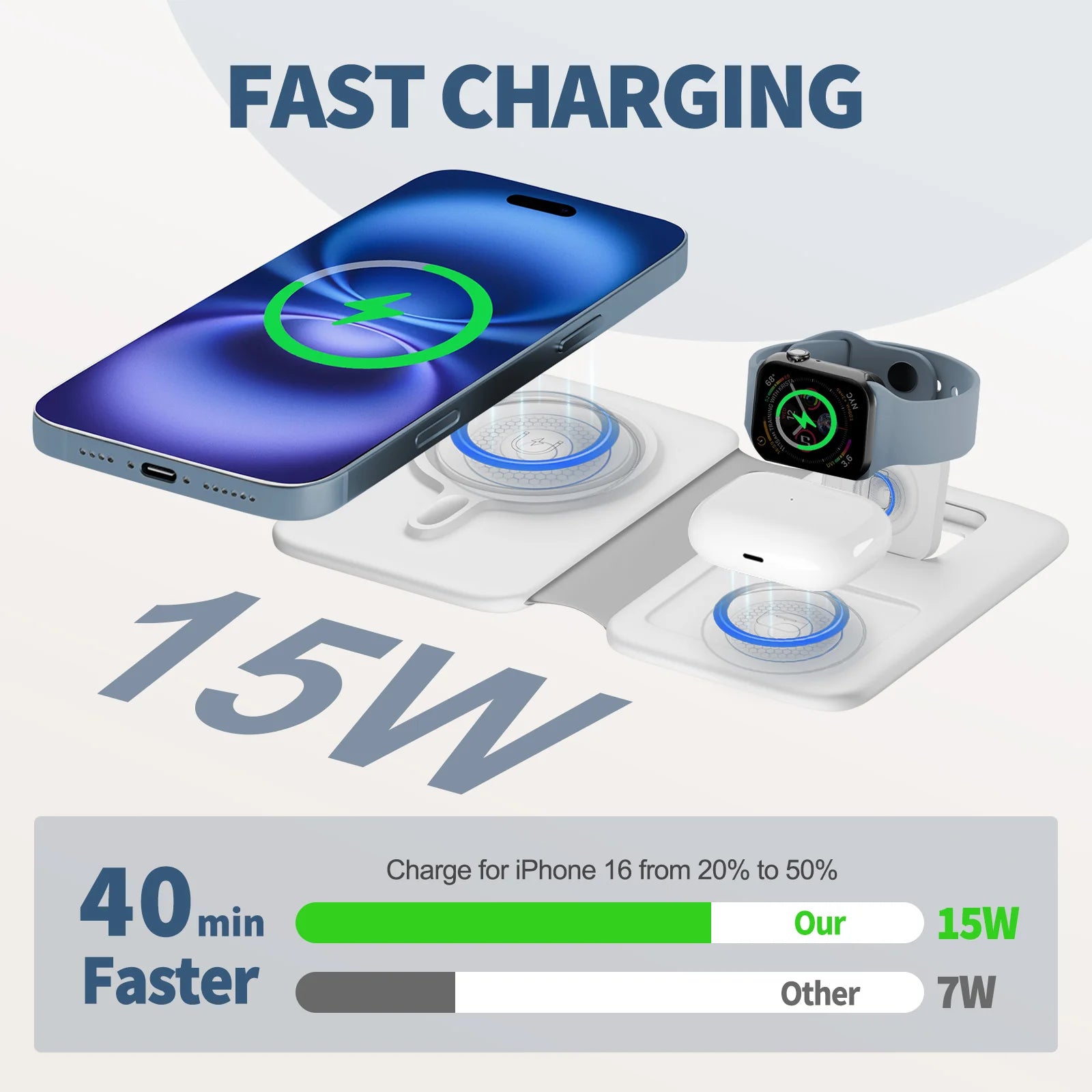 Magnetic Wireless Charger Pad 3 in 1 15W Portable Fast Charging Phone Holder for iPhone 17 1615 14 Pro Max Apple Watch AirPods