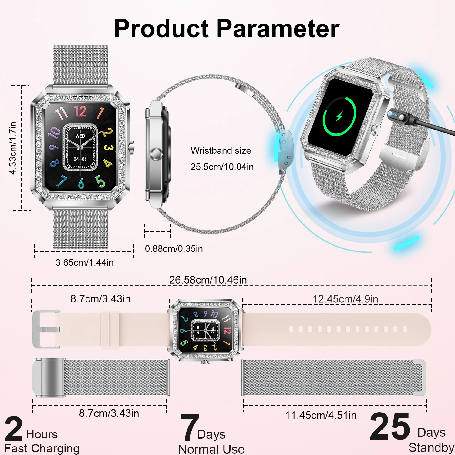 Function: Passometer,Message Reminder,Call Reminder,Push Message,Chronograph,Alarm Clock,Calendar