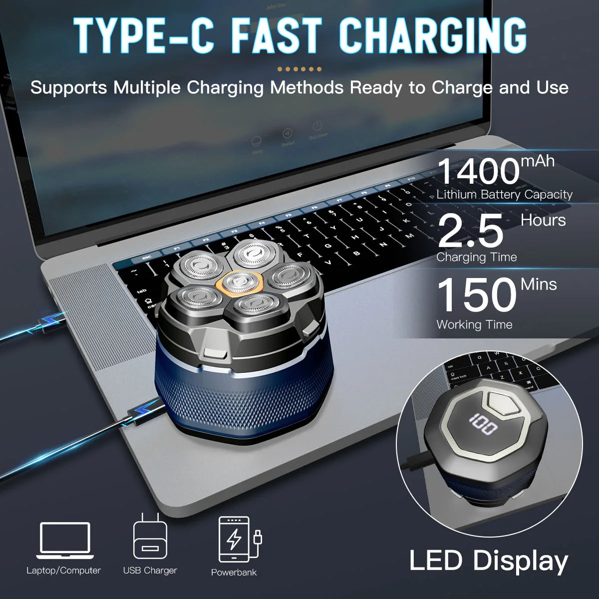 Function: wet haircut,dry haircut,floating head,Washing knives under water,Fast Charging,Charging indication