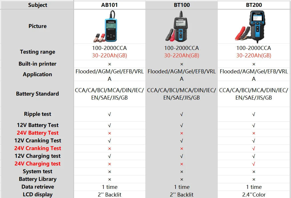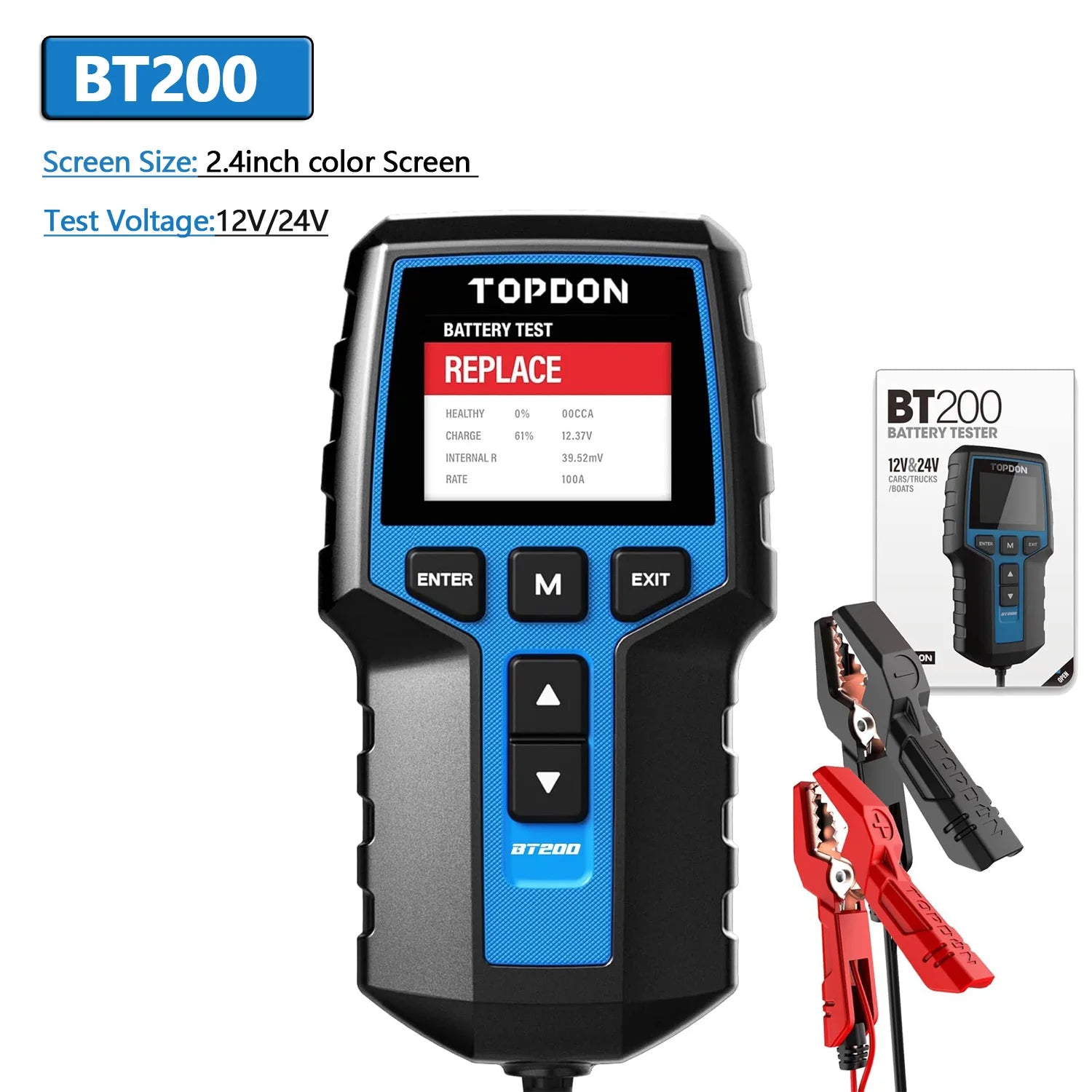 TOPDON BT200/BT100 Battery Tester Charging Cranking Test Tools for Car 24V/12V Automotive Diagnostic Battery Monitor 100-2000CCA