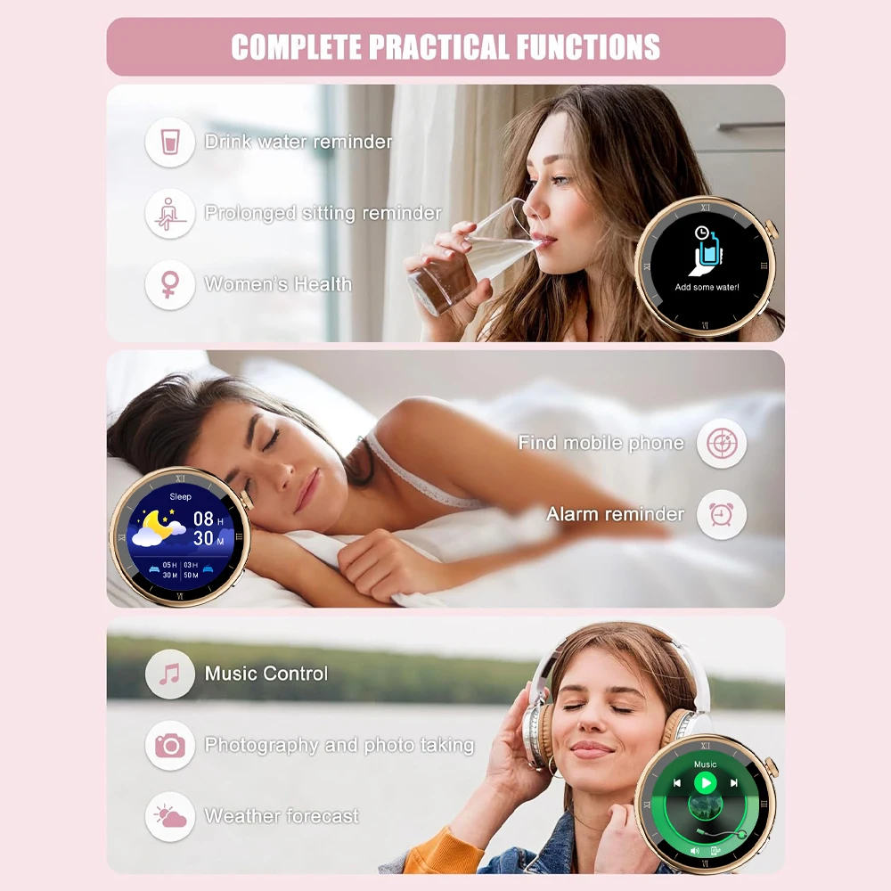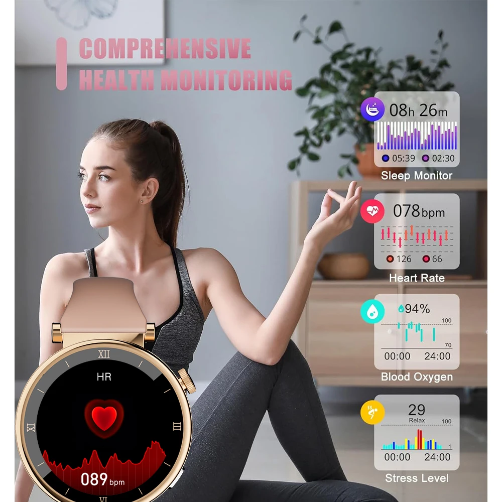 Smart watches for women has advanced sensors to help you detect real-time heart rate, blood pressure, blood oxygen throughout the day. It automatically monitors your sleep status and provides comprehensive sleep quality analysis and synchronizes it to the App