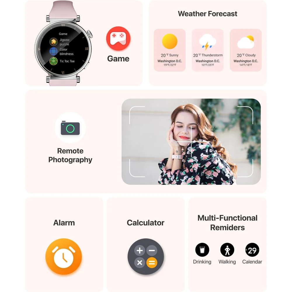 Smart watches for women is equipped with a powerful 300mAh battery. It only takes 2 hours to fully charge, providing up to 5 days of working time and 30 days of standby time. The smart watch women also has many practical tools, such as weather forecast, camera control, music control, sedentary reminder, adjustable brightness, phone/watch search, alarm clock, stopwatch, timer, etc. to meet your various daily needs