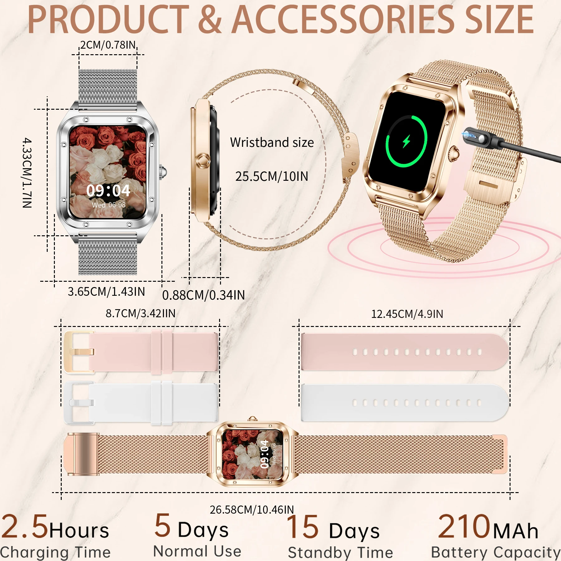 SMART WATCHES FOR WOMEN ANDROID & IPHONE COMPATIBLE: Smart watch woman compatible with iphone 7.1 and above, Android 4.4 and above. IP68 waterproof rating design allows you to wear with confidence during hand washing and rainy days (CANNOT used in hot baths) With a built-in 210mAh large-capacity battery, fully charged in 2.5 hours for 3-7 days of use and up to 25 days of standby time.